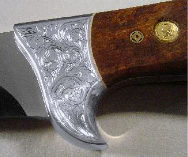 Vista ampliada del logo de oro y la guarda de plata grabada por Carlos Chiara.