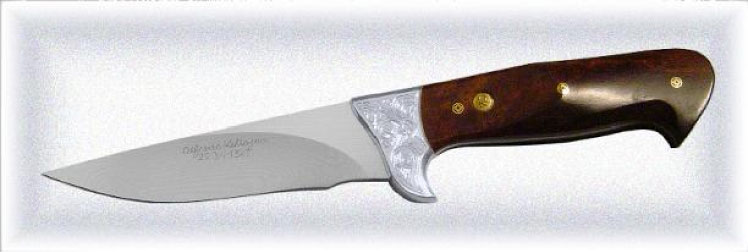 Hoja de 4 x 25 x 110 mm. de ATS 34, guarda de plata 950 grabada, logo de oro 24 K. y cachas de Ironwood.